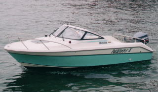 ペパーミントグリーンのサイドラインがなかなかお洒落。115馬力の船外機は私のようなヘナチョコ釣り師には充分過ぎました。大人二人が横になれるキャビンスペースにオプションでトイレも設置し、装備もバッチリ!ただし、操縦席がオープンなので冬場のクルージングはけっこう厳しいものがありました。さらに、子供がちょろちょろ動き始めたこともあり、ちゃんとしたキャビンつきのボートが欲しくなっていくのであります(笑)。